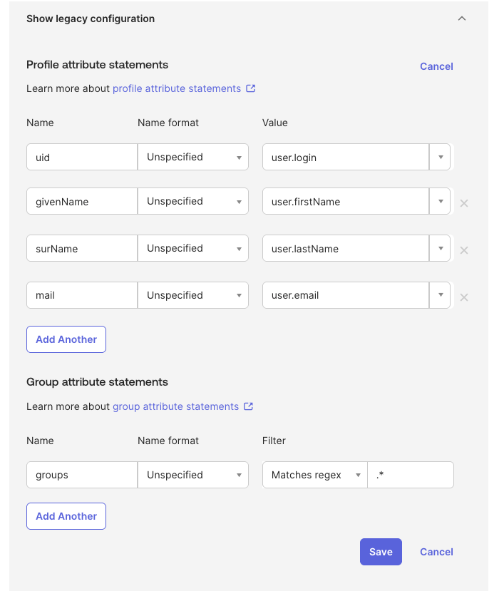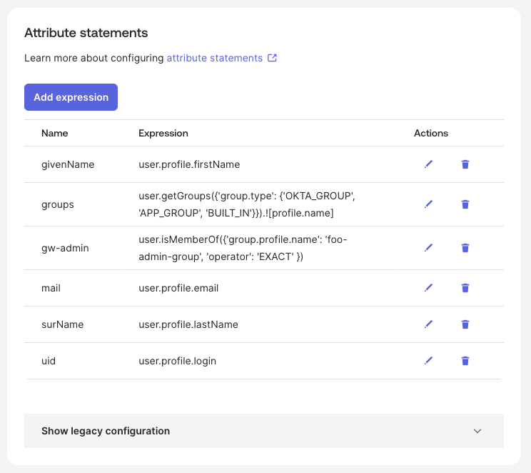 If you do not want to use EL for SAML attributes, you can still use Okta’s legacy configuration as follows.