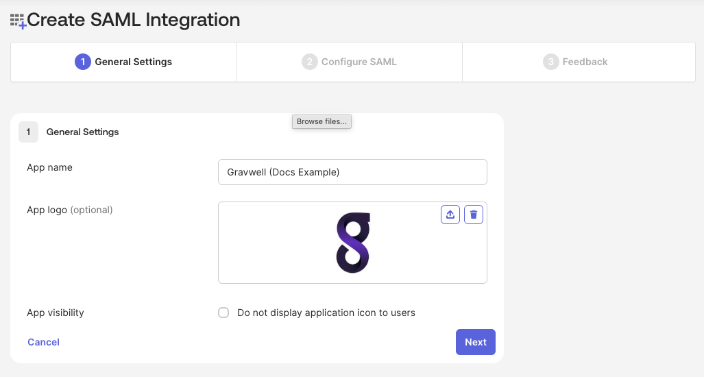 Name your SAML 2.0 application and upload an image so that users know what they are interacting with; feel free to grab our logo and use it. Proceed to step 2 (Configure SAML).