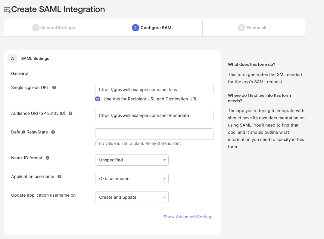 Make sure to set the appropriate fully qualified URL for your SSO URL and SP Entity ID URL; given the domain of gravwell.example.com the appropriate URLs are https://gravwell.example.com/saml/acs and https://gravwell.example.com/saml/metadata.