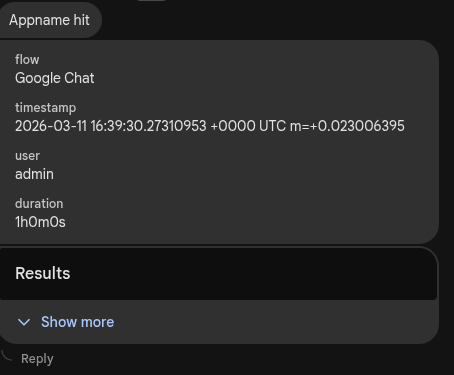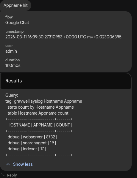 This example gathers information about currently-connected ingesters, formats that information using structured fields, and posts it to a Google Chat space.