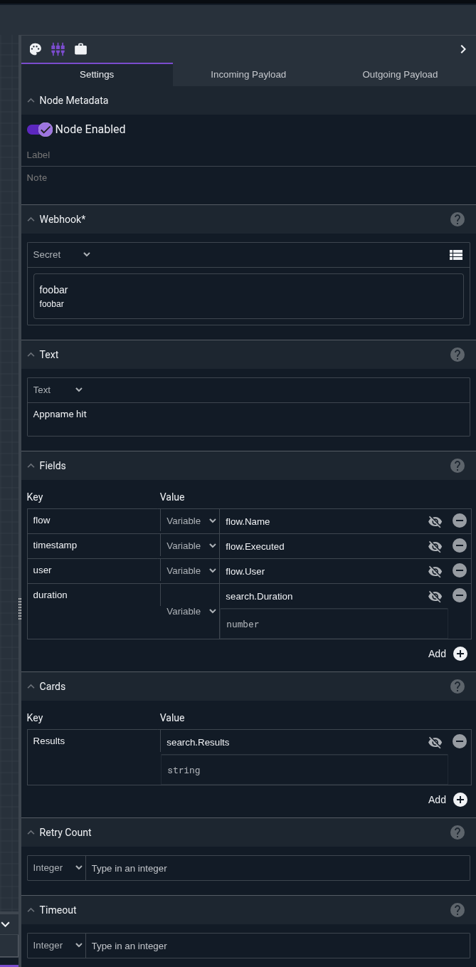 Webhook, required: a Google Chat webhook URL for the space you wish to send to.Text: the text message to send. This will appear as the main message text in the chat space.Fields: optional key-value pairs to display as structured data in a single card. These will be rendered as decorated text widgets with labels.Cards: optional named inputs that will be formatted as separate collapsible cards with titles. Each card can contain structured data, lists, or text.Retry Count: number of retry attempts if sending fails (default: 0, which means a single attempt with no retries).Timeout: timeout in seconds for each request (default: 5).